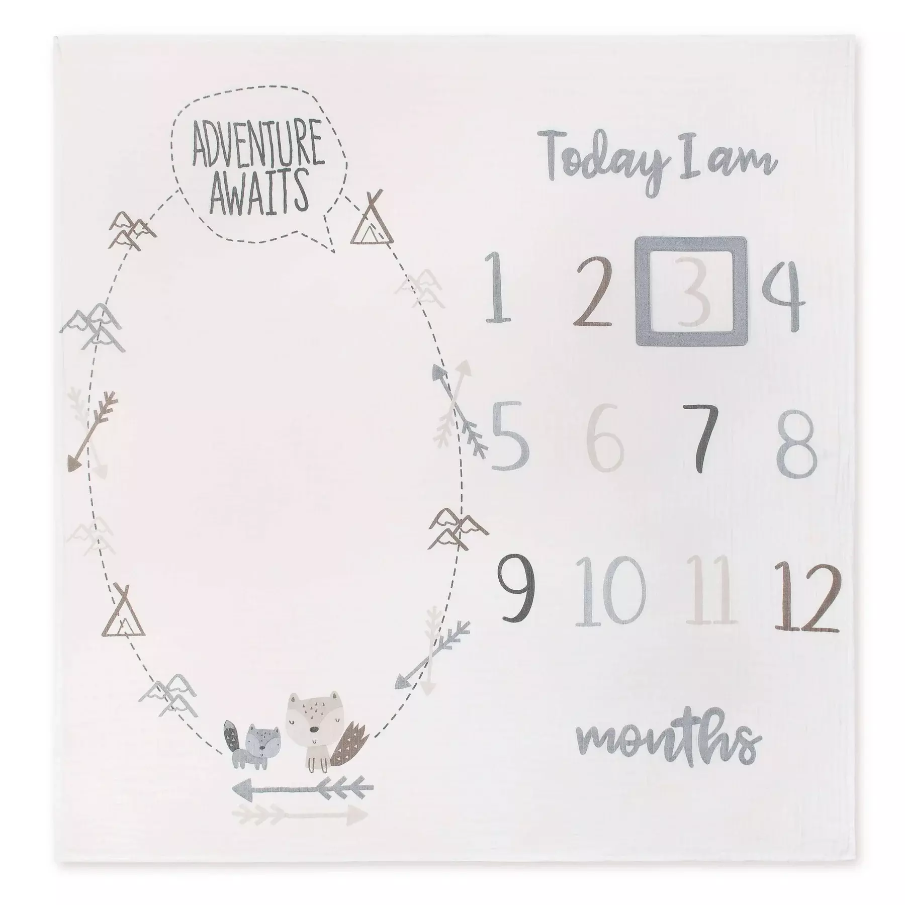 Monthly Milestone blanket that includes with a soft, moveable frame that allows you to chart his growth. Its stylish, printed pattern provides the perfect backdrop for pictures.
