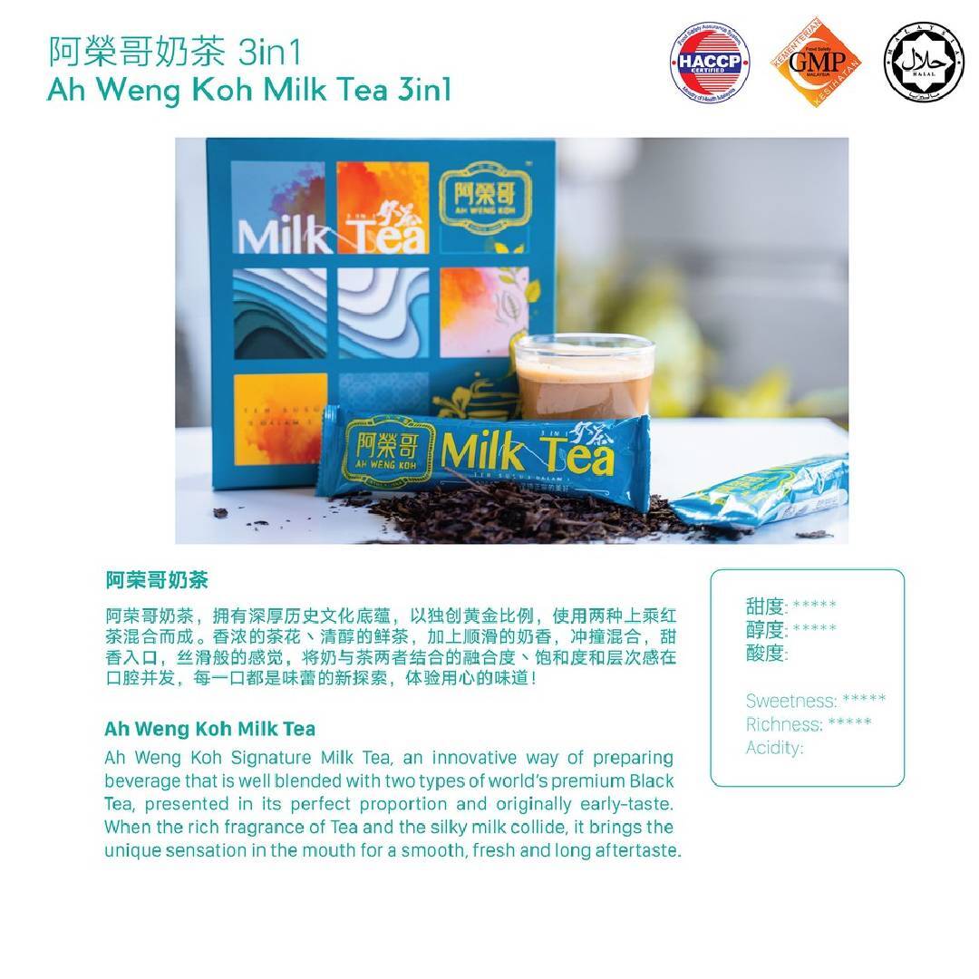 Since 1964, Ah Weng Koh Hainan Tea plays a role of Malaysian's collective memories, especially for those originated from Kuala Lumpur. Ah Weng Koh Signature Milk Tea, an innovative way of preparing beverage that is well blended with two types of world’s premium Black Tea, presented in its perfect proportion and originally early-taste. When the rich fragrance of Tea and the silky milk collide, it brings the unique sensation in the mouth for a smooth, fresh and long aftertaste.
